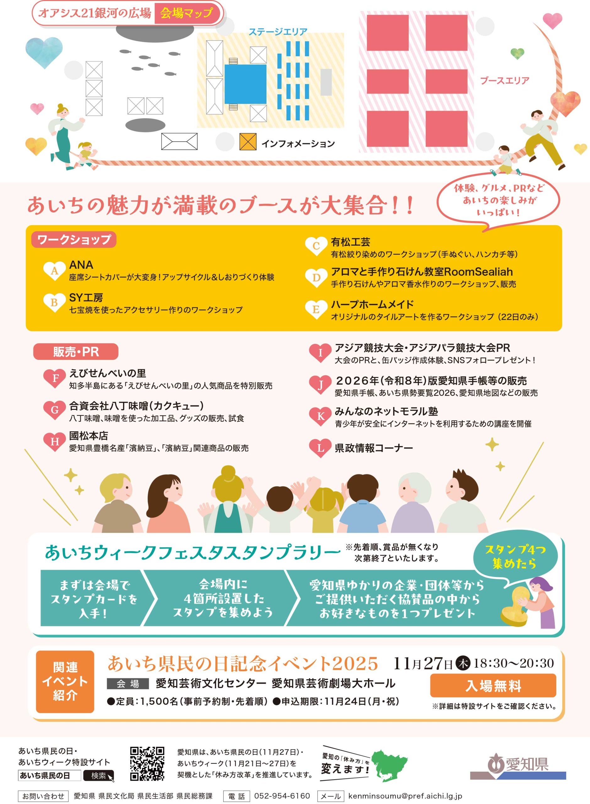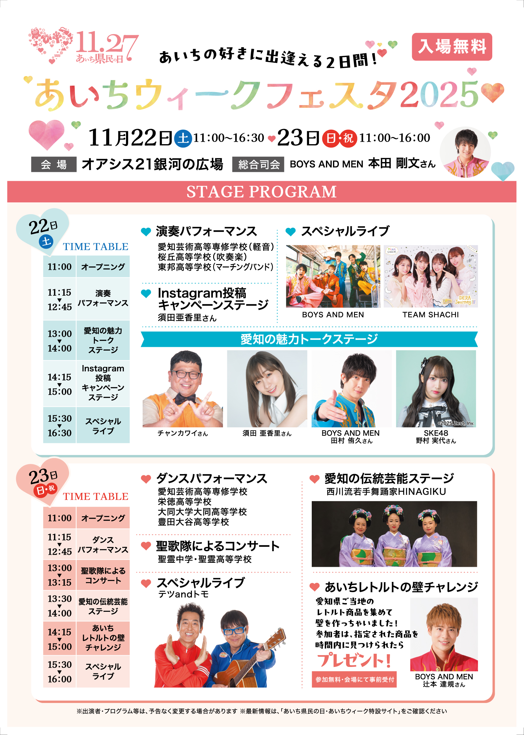 この2日間は、県民の皆さまに「あいち県民の日」と、その前後1週間の「あいちウィーク」をもっと知って、もっと楽しんでいただく特別な時間です。