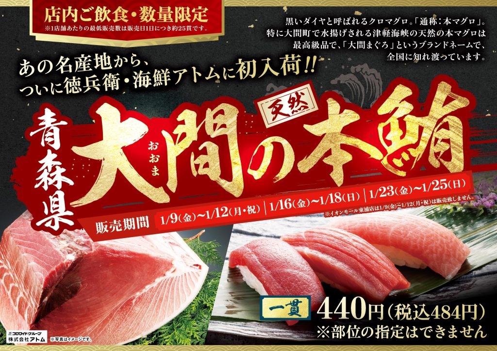 青森県 大間の天然本鮪を2026年1月9日(金)〜1月12日(月・祝)、1月16日(金)〜1月18日(日)、1月23日(金)〜1月25日(日)限定で数量限定販売いたします!