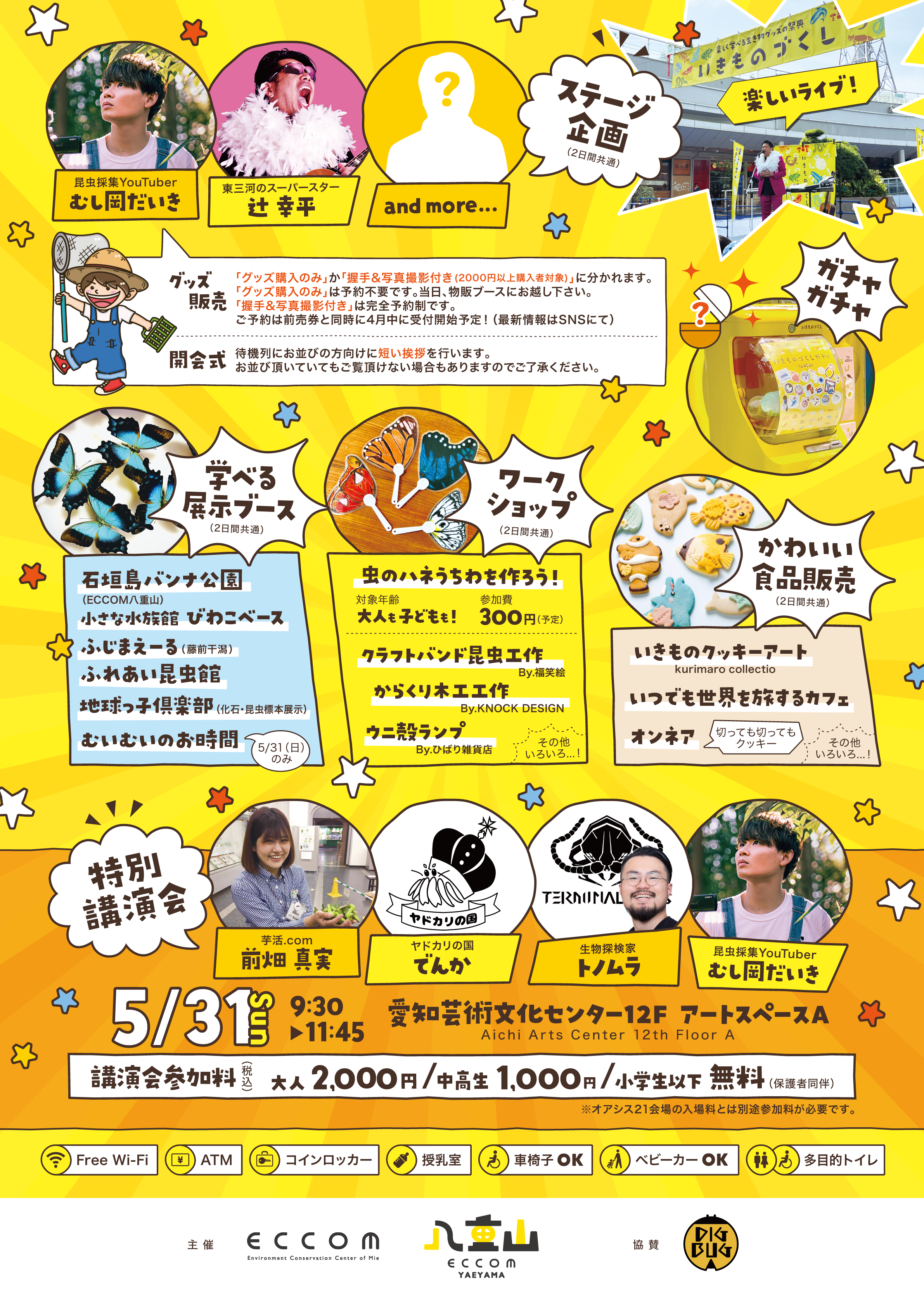 いきものづくし2026 全国のいきものグッズ作家100 名超が集結! 個性的な生物モチーフのグッズ販売に加え、オリジナルガチャ、生物生体展示、水族館・昆虫館の出張ブース、ステージ(がまごおり深海魚のうたライブ他)、特別講演会など、様々な企画が予定されている。 日時 5/30 14:30~18:00 5/31 13:00~18:00 入場料 大人1,200円 中高生900円 小学生以下無料(保護者同伴)